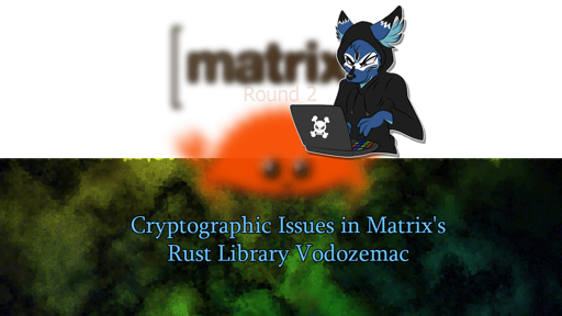 arrow-up11arrow-down1external-linkCryptographic Issues in Matrix’s Rust Library Vodozemac - Dhole Momentsplus-squaresoatok.blogSoatok Dreamseeker@pawb.socialEnglish · 17 days agomessage-square0linkfedilink