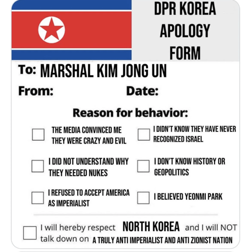 ☆ Yσɠƚԋσʂ ☆@lemmy.ml to Memes@lemmy.mlEnglish · 4 days agoDPRK Apology Formlemmy.mlimagemessage-square18linkfedilinkarrow-up164arrow-down142