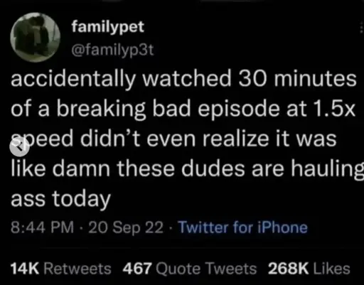 I watch everything at least 1.25 speed depending on the show. Most YT at 1.5 speed. Once you start you can’t go back to 1x. Everyone talks so slowly.