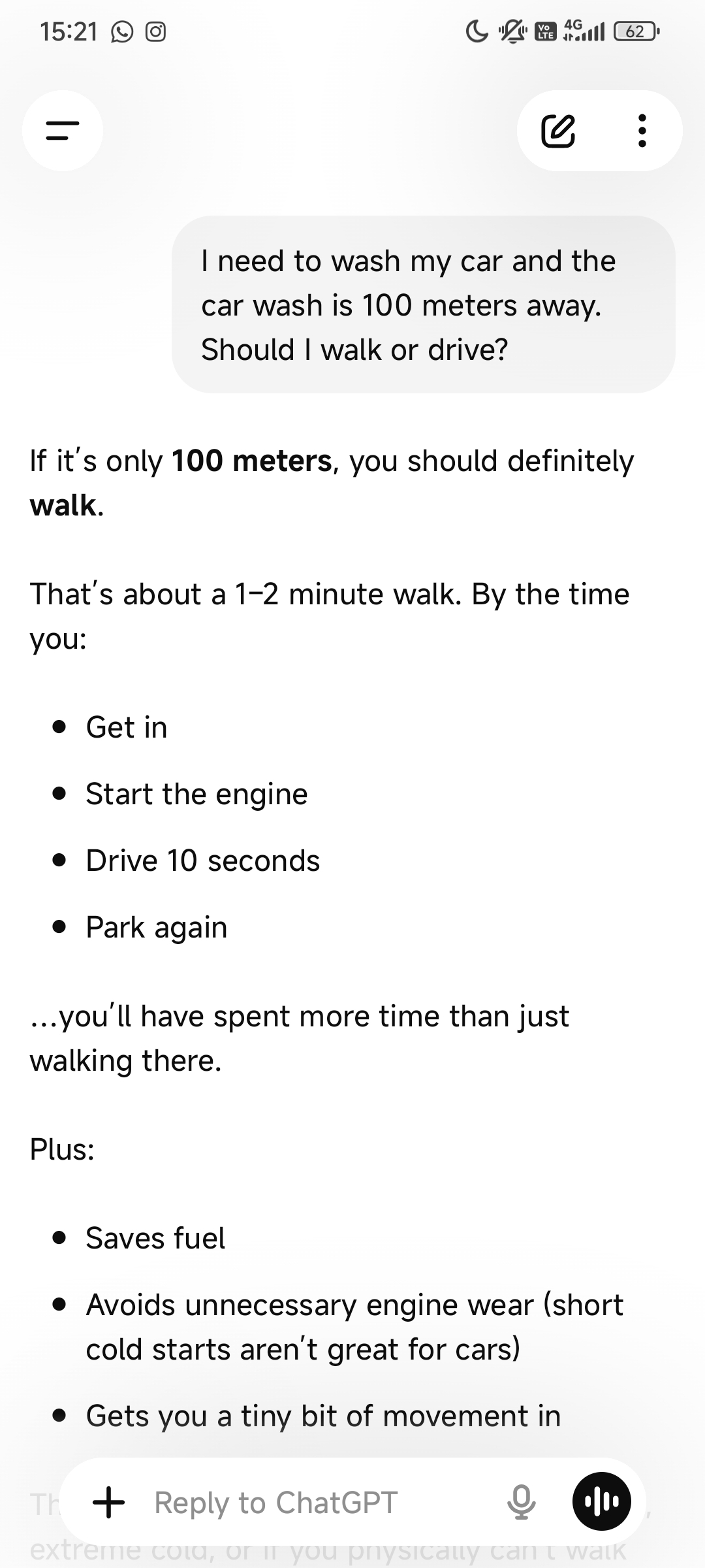 I just did tried in ChatGPT and it said „Walk“. But at the bottom it added: The only reason to drive would be: You need to move the car there directly for washing and can’t push.